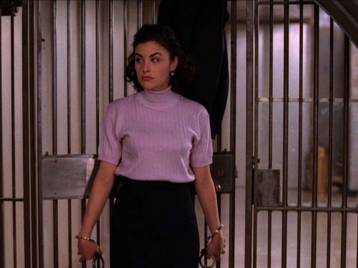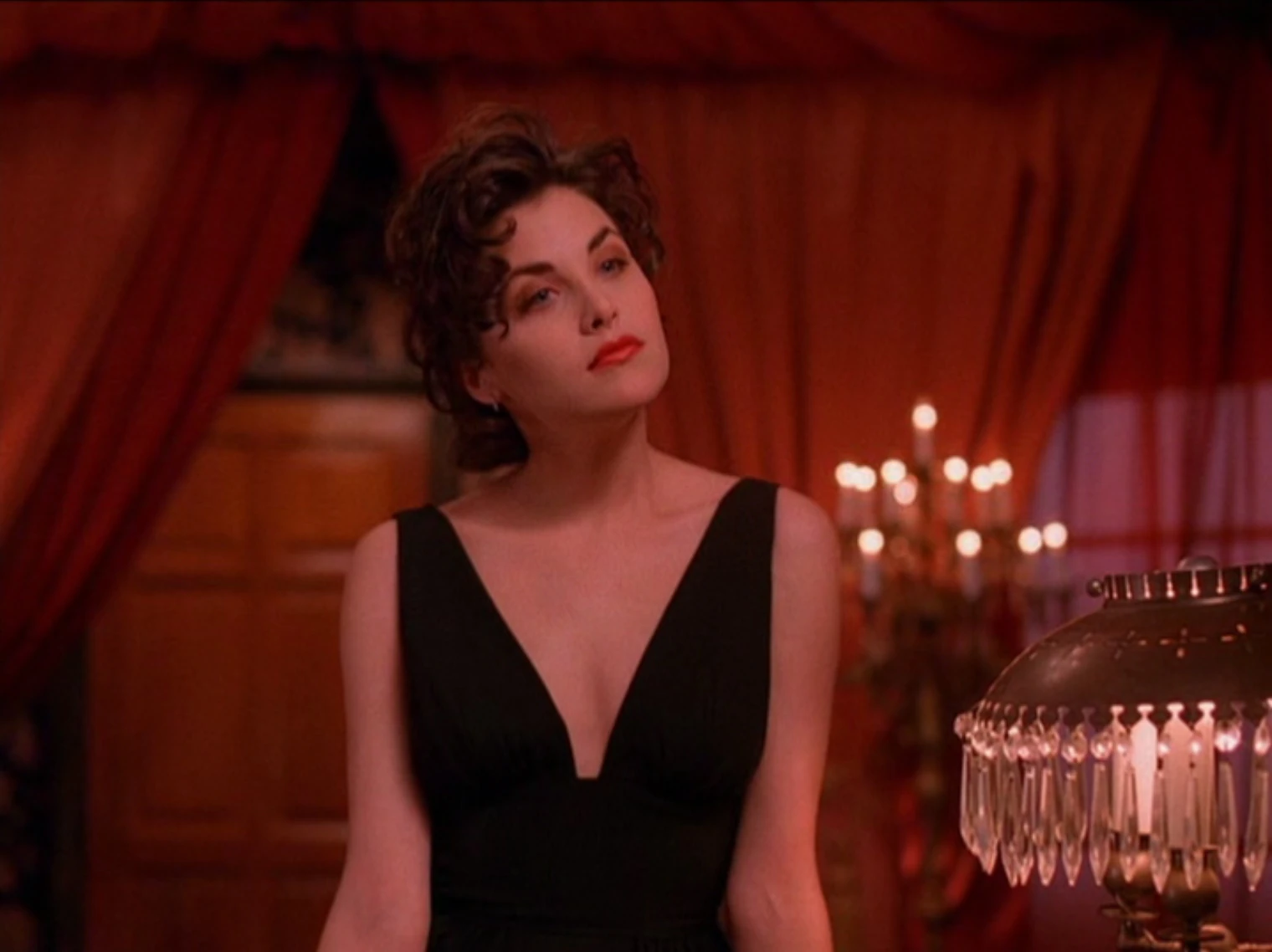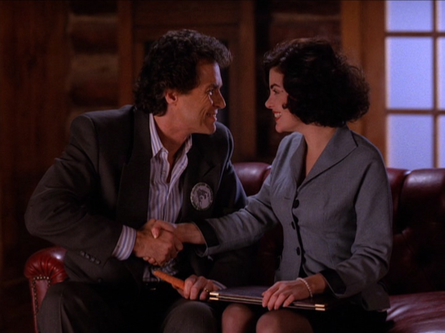After Leo Johnson confesses to Laura's murder, Audrey (played by Victoria Jackson) goes to Agent Cooper's room at the Great Northern. He asks her if she found any leads at the perfume counter, but she says she quit the job after Leo confessed. She gives him a present, tying a ribbon into a bow with her tongue.