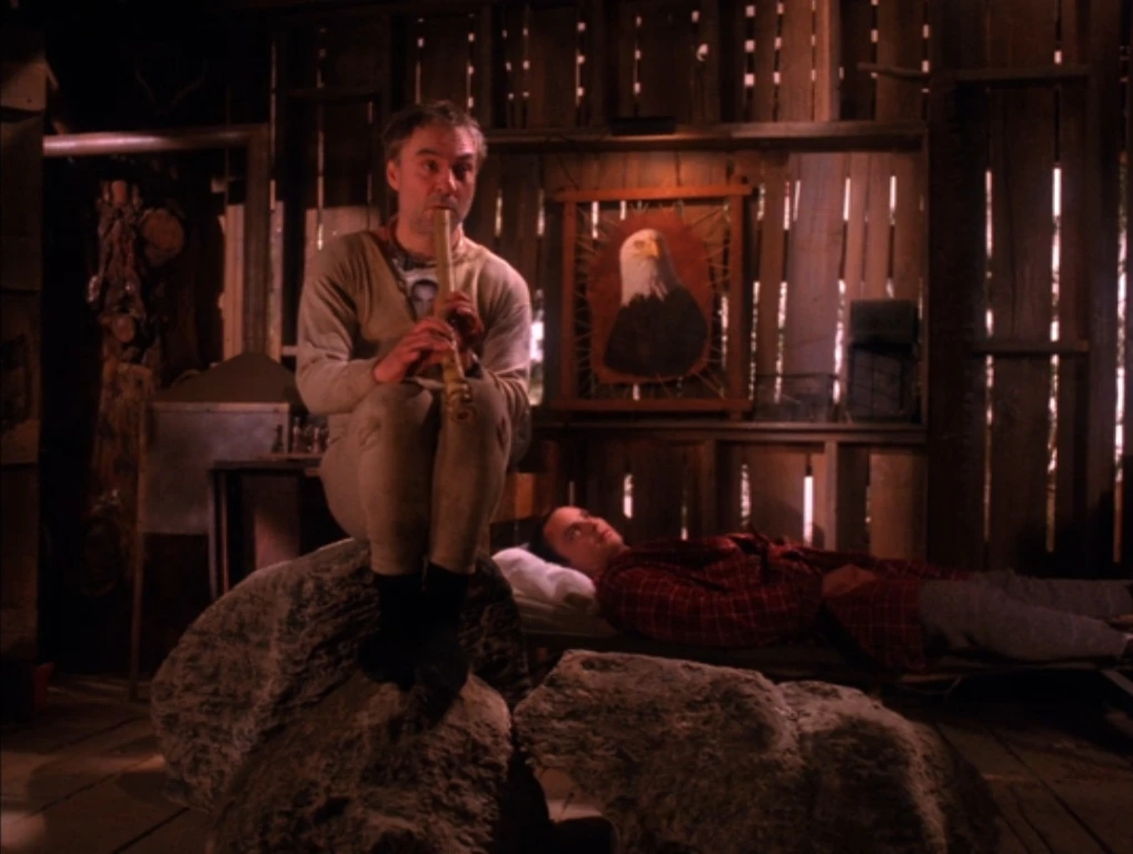 Cooper looks at a photo of Caroline as Earle passes behind him, delivering a message for Audrey to the hotel's front desk. Dale goes to his room, where he finds a death mask of Caroline along with a tape-recorded message from Windom.